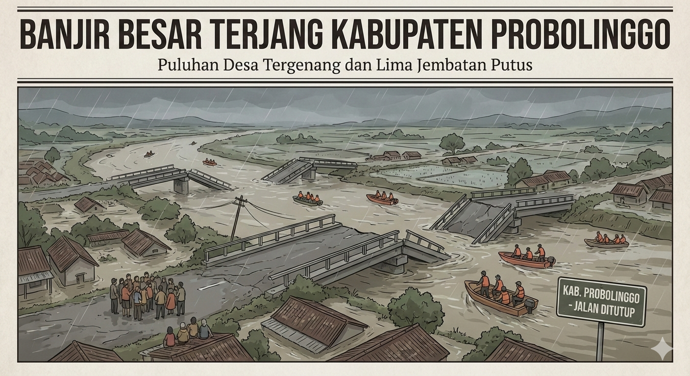 Probolinggo — Hujan ekstrem yang mengguyur hampir seluruh wilayah Kabupaten Probolinggo sejak pertengahan Januari 2026 menyebabkan bencana banjir meluas, berdampak pada puluhan desa, infrastruktur rusak, dan mobilitas warga terganggu. Banjir ini dipicu oleh curah hujan tinggi yang terus mengguyur kawasan dalam beberapa hari terakhir, membuat debit sungai meningkat serta air meluap ke permukiman warga di berbagai kecamatan.